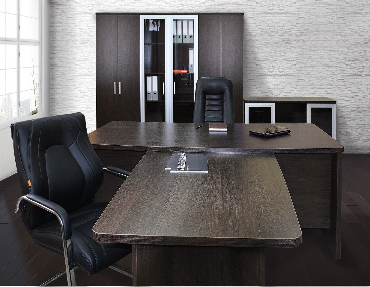 Все изделия устанавливаются на регулируемые по высоте опоры. Задние стенки тумб изготавливаются из ЛДСП, шкафов из ХДФ. Стеклянные двери шкафов в рамочном профиле.